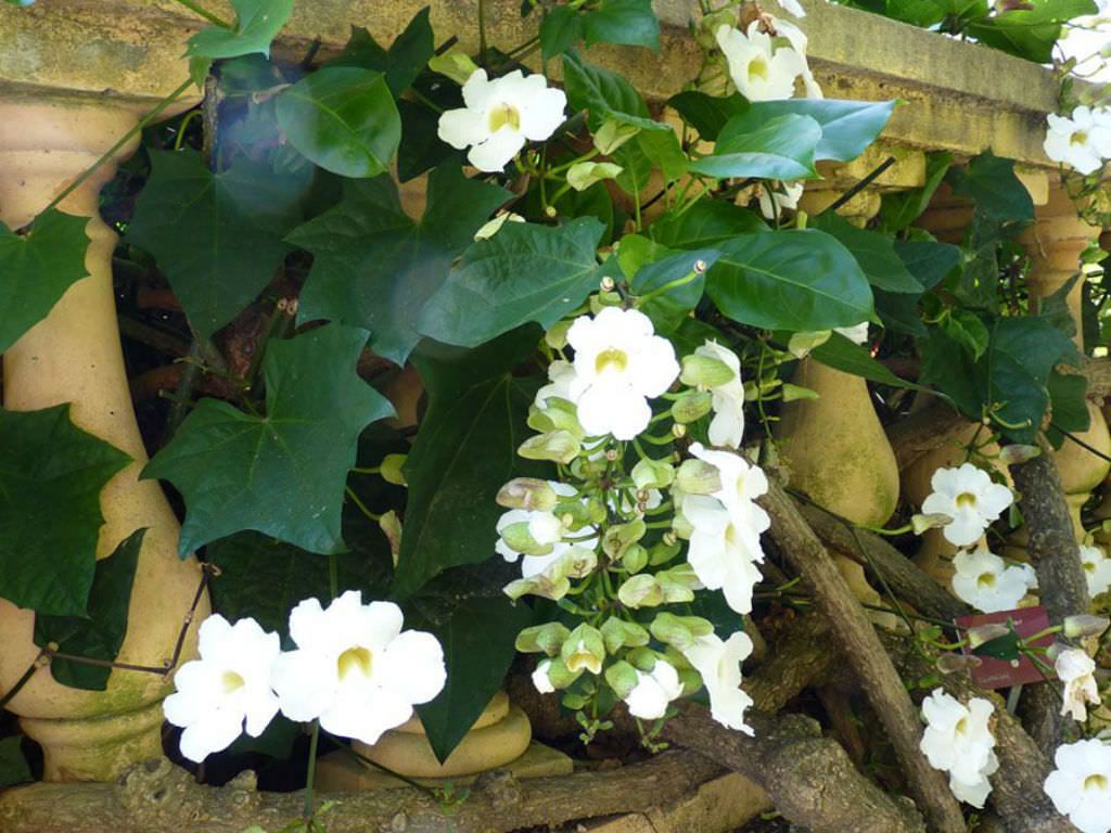 A vigorous, perennial climbing plant, profusely blooming with white, trumpet-shaped flowers