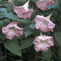 Belonging to the Deadly Nightshade family, which also includes the tomato, Brugmansia comprises about 20 different species, nearly all of them poisonous. There are a number of cultivars of Brugmansia suaveolens, some with white or yellow flowers. It's a showy landscape evergreen plant. The more sun, the more flowers. Can be pruned into a nice small accent tree. Put it where you can enjoy the fragrance at night. Blooms on and off all year. Easy to grow. Not fussy about soil or water. Likes lots of fertilizer.